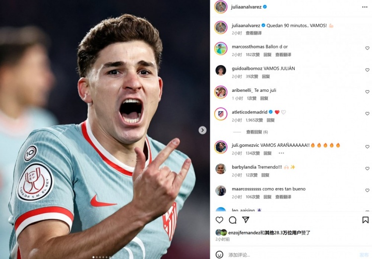 2025-02-26 16:07:37對(duì)巴薩傳射建功,阿爾瓦雷斯社媒曬照:還有90分鐘,我們加油!