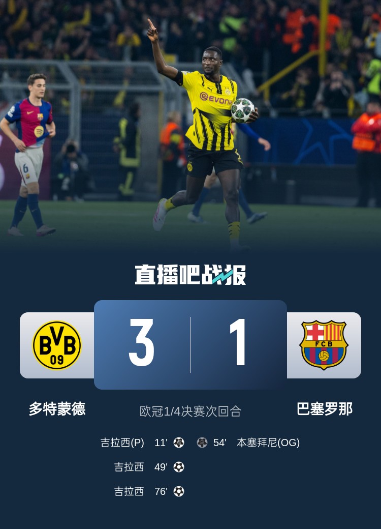 功虧一簣,多特球員打進4球,但遺憾告別本賽季歐冠 維拉3-2巴黎數(shù)據(jù):射門17-14,射正9-7,得分機會6-3,犯規(guī)15-3 多特3-1巴薩全場數(shù)據(jù):射門18-7,射正11-2,進球機會5-0 吉拉西本場數(shù)據(jù):6次射門打進3球,錯失2次機會&評分8.4全場最高 盡力了,多特球員哨響后癱倒在地 涉險過關(guān)!巴黎9次晉級歐洲重要賽事半決賽,法國球隊中最多 單賽季歐冠打進13球,吉拉西是歷史第8位做到這一點的球員 六年了,歐冠半決賽我們回來了 放下包袱!巴薩輸球晉級,24場不敗終結(jié)&什琴斯尼22場不敗終結(jié) 1-3客負多特,巴薩吃到2025年首敗&各賽事24場不敗也遭到終結(jié) 法國球隊近6次參加歐冠1/4決賽均晉級,上次出局是15-16賽季 巴薩第17次晉級歐冠半決賽,此前16次半決賽7次晉級 什琴斯尼遭巴薩生涯首敗,此前出戰(zhàn)22場收獲19勝3平 法國俱樂部歐冠比賽領(lǐng)先2球最終落敗,賽事歷史第三次 兩次帶領(lǐng)法國球隊晉級歐冠四強,恩里克是歷史第四人 迪馬濟奧:弗拉尼與塔雷尚未達成協(xié)議,但一切都朝著這一方向發(fā)展 1次助攻2次關(guān)鍵傳球,登貝萊當(dāng)選維拉3-2巴黎全場最佳球員 上演帽子戲法,吉拉西當(dāng)選多特3-1巴薩一役全場最佳球員 什琴斯尼數(shù)據(jù):8次撲救,1次送點,2攔截2解圍,評分8.0全隊最高 盡力了!多特本場射正11次,近5個賽季歐冠對陣巴薩單場射正最多
