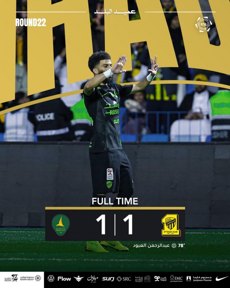 吉達聯(lián)合客場1-1戰(zhàn)平卡利杰,聯(lián)賽4連勝終結。