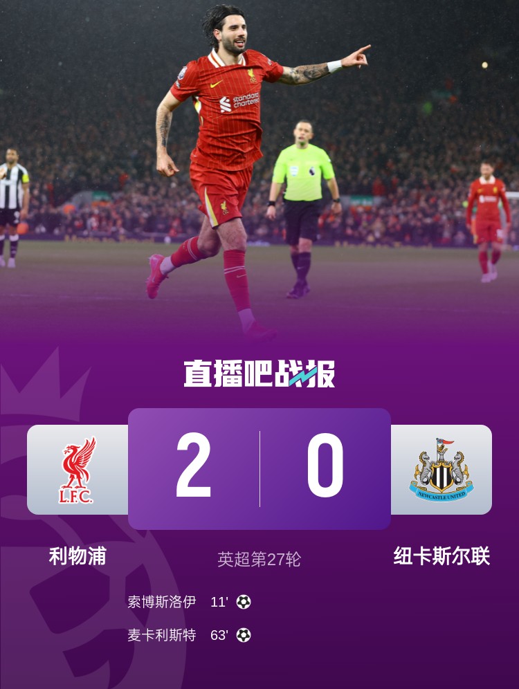 索博斯洛伊、麥卡利斯特破門,利物浦主場2-0戰(zhàn)勝紐卡,多賽一場領先阿森納13分。
