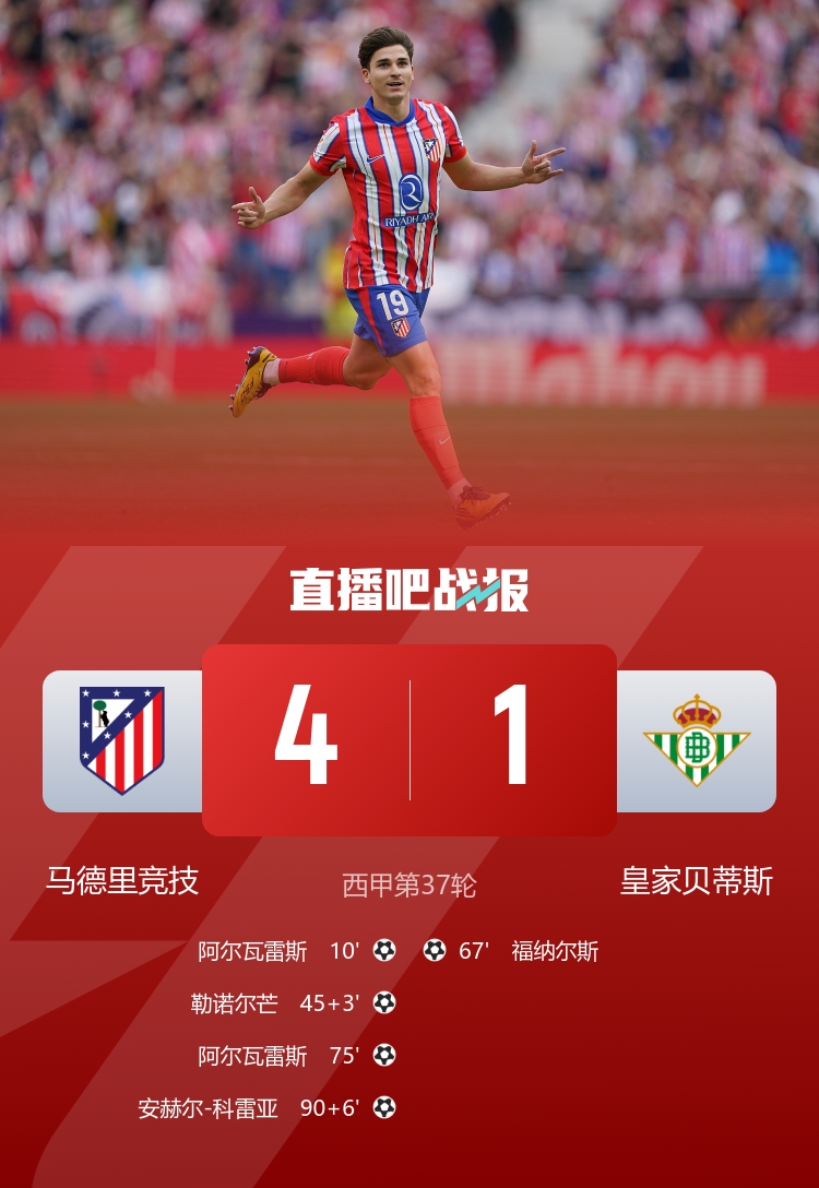 西甲第37輪,馬競(jìng)4-1輕取貝蒂斯,阿爾瓦雷斯梅開(kāi)二度。