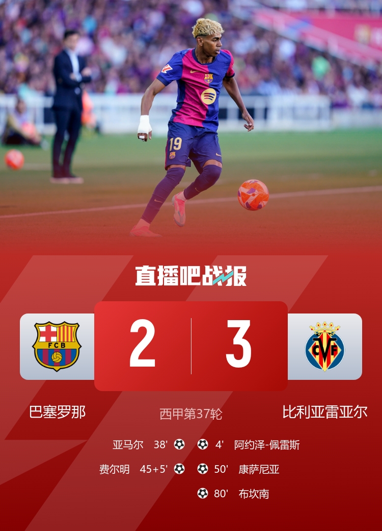 西甲聯(lián)賽第37輪,巴薩2-3比利亞雷亞爾,亞馬爾、費(fèi)爾明進(jìn)球。
