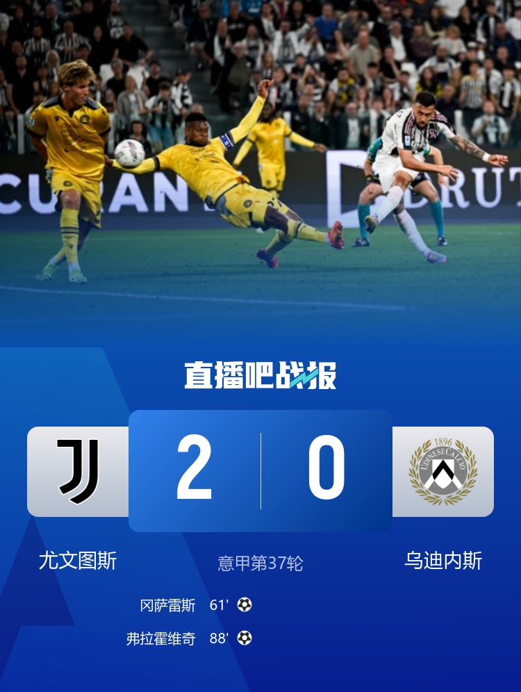 意甲第37輪,尤文圖斯2-0烏迪內(nèi)斯,掌握爭(zhēng)四主動(dòng)權(quán),岡薩雷斯、弗拉霍維奇進(jìn)球。