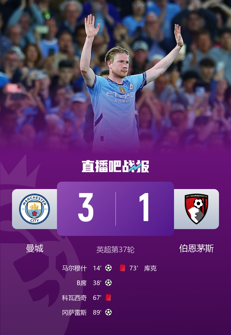 英超第37輪,曼城3-1伯恩茅斯。上半場馬,爾穆什世界波,德布勞內(nèi)空門擊中橫梁,京多安助攻B席再下一城;下半場,科瓦西奇直紅,庫克也被直紅罰下,羅德里復(fù)出,尼科-岡薩雷斯個人英超首球,幫助球隊(duì)鎖定勝局。
