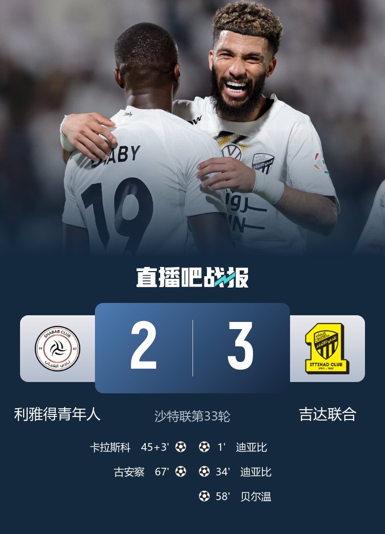 沙特聯(lián)第33輪,吉達(dá)聯(lián)合3-2利雅得青年人。上半場,迪亞比開場30秒閃擊+梅開二度,卡拉斯科扳回一城;下半場,坎特助攻,貝爾溫傳射,古安察再追一球。