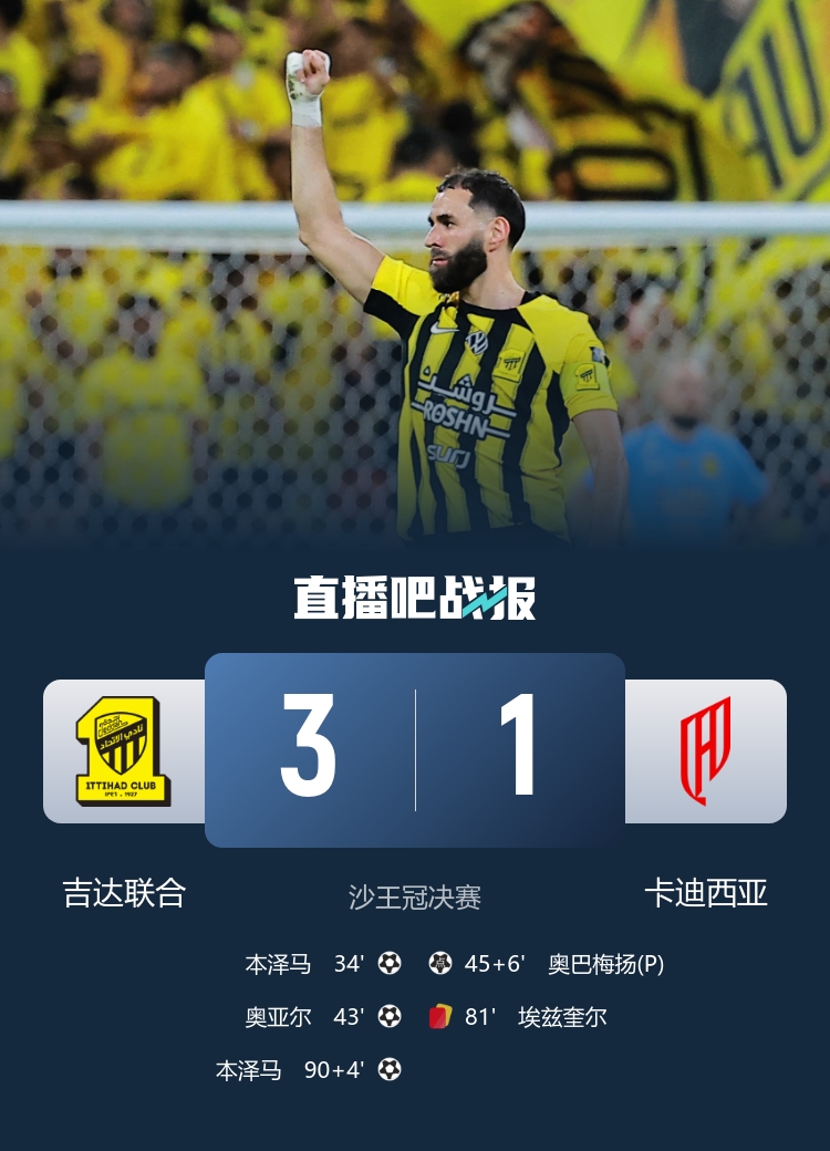沙王冠決賽,本澤馬梅開二度,吉達(dá)聯(lián)合3-1卡迪西亞。
