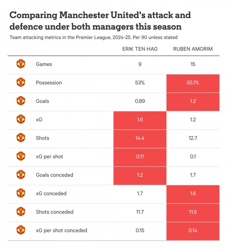 阿莫林加盟至今,曼聯(lián)在比賽中的關鍵指標是否發(fā)生了變化?