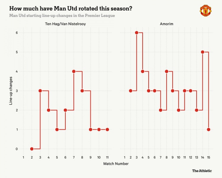 在對陣埃弗頓的比賽中,阿莫林的首發(fā)名單中只有一個位置進行了調(diào)整,這也是他15場聯(lián)賽中調(diào)整最小的一次。
