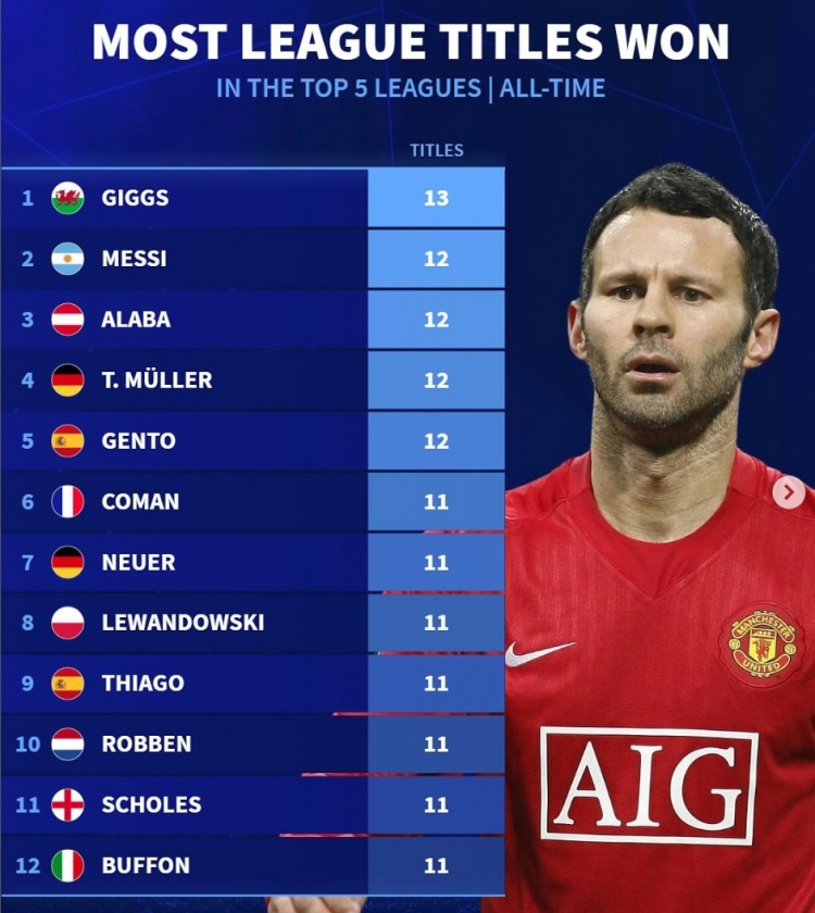 2025-03-01 08:10:05五大聯(lián)賽歷史奪冠榜:吉格斯13冠居首,梅西、阿拉巴、穆勒12冠