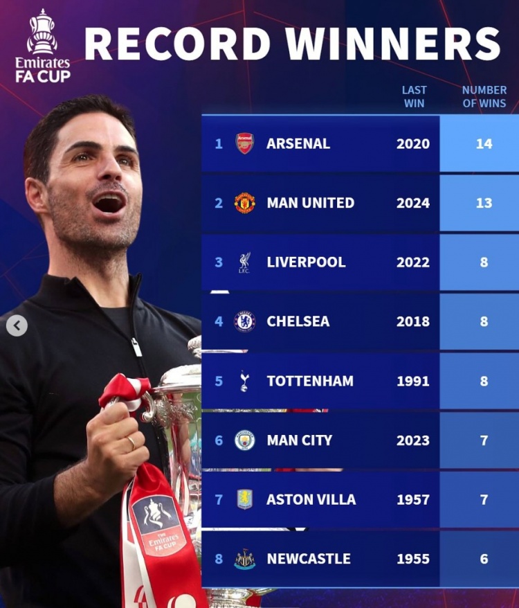 2025-03-01 08:10:07本屆BIG6僅剩曼市雙雄!足總杯歷史奪冠榜:阿森納14次、曼聯(lián)13次