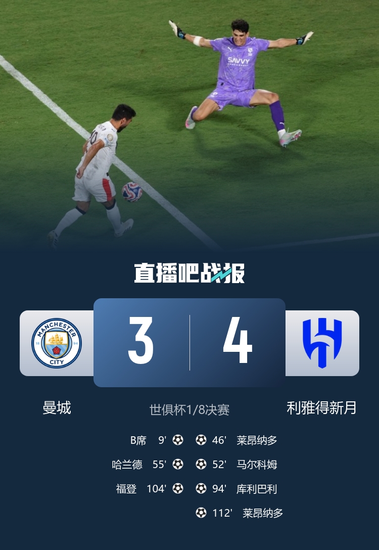 7月1日訊 世俱杯1/8決賽,曼城加時賽3-4不敵利雅得新月,無緣下一輪。
