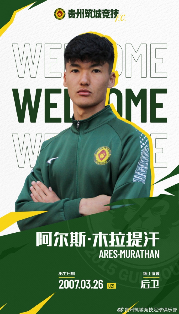 ??經(jīng)與球員協(xié)商一致,阿爾斯-木拉提汗正式加盟貴州筑城競(jìng)技足球俱樂(lè)部。阿爾斯-木拉提汗2007年3月26日出生于新疆烏魯木齊,身高192cm,體重80kg,司職中后衛(wèi)。