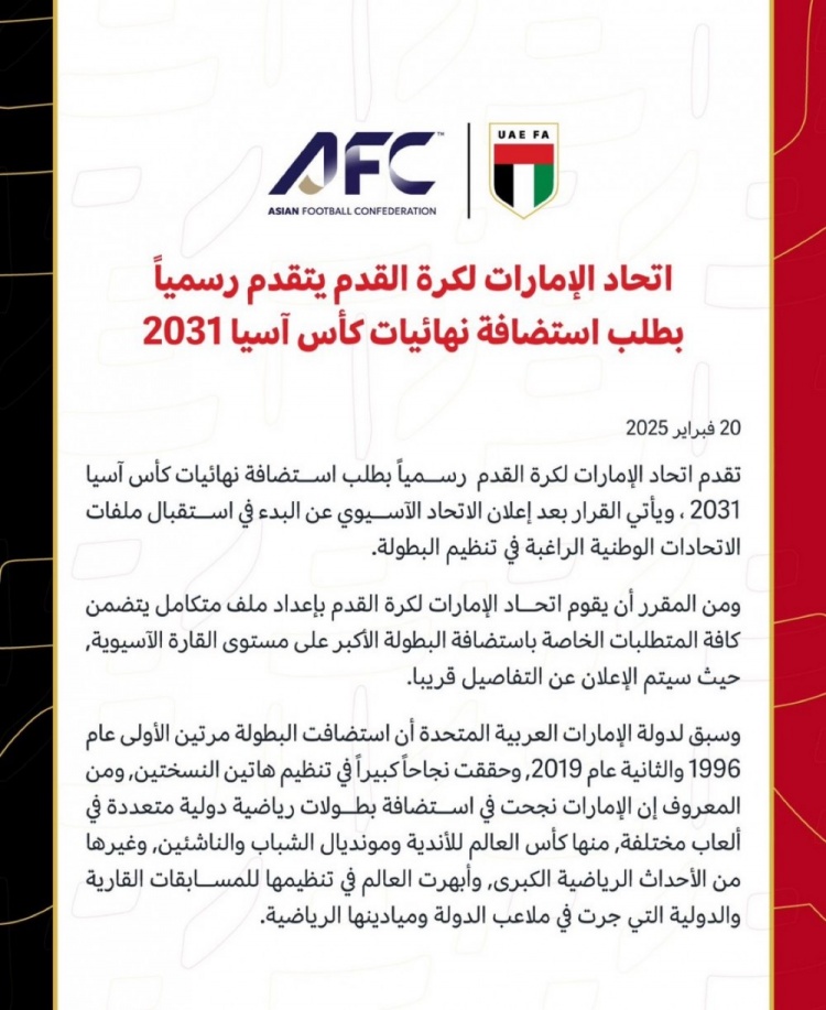 2025-02-21 17:47:09官方:阿聯(lián)酋足協(xié)申辦2031年亞洲杯