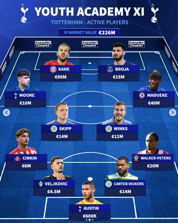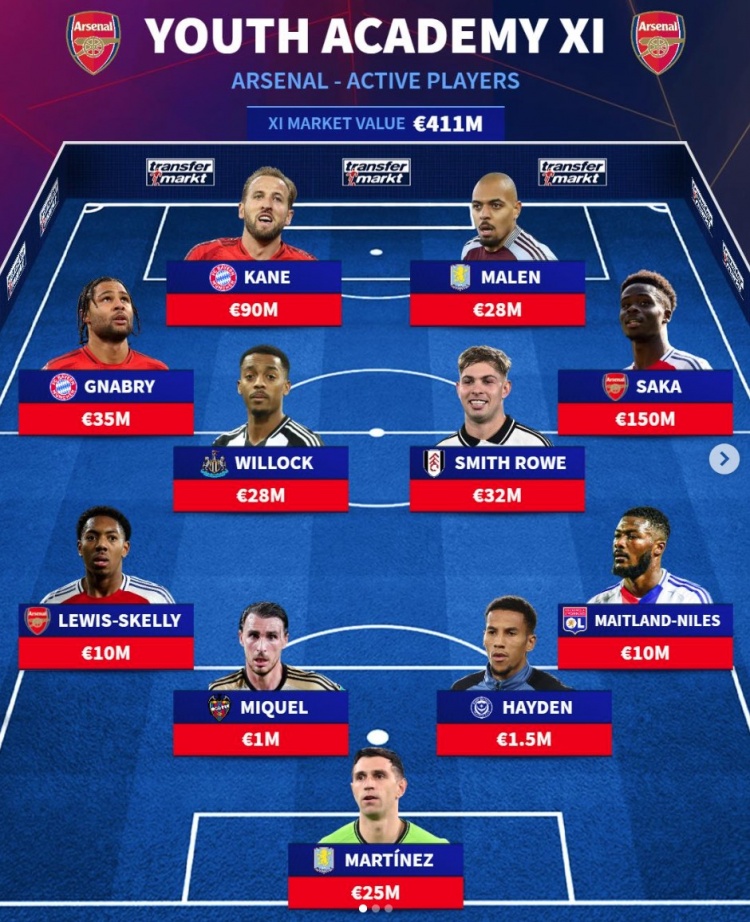 德轉(zhuǎn)列槍車刺三隊(duì)青訓(xùn)出品當(dāng)前最貴陣:薩卡、賴斯、凱恩在列