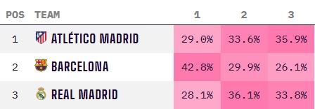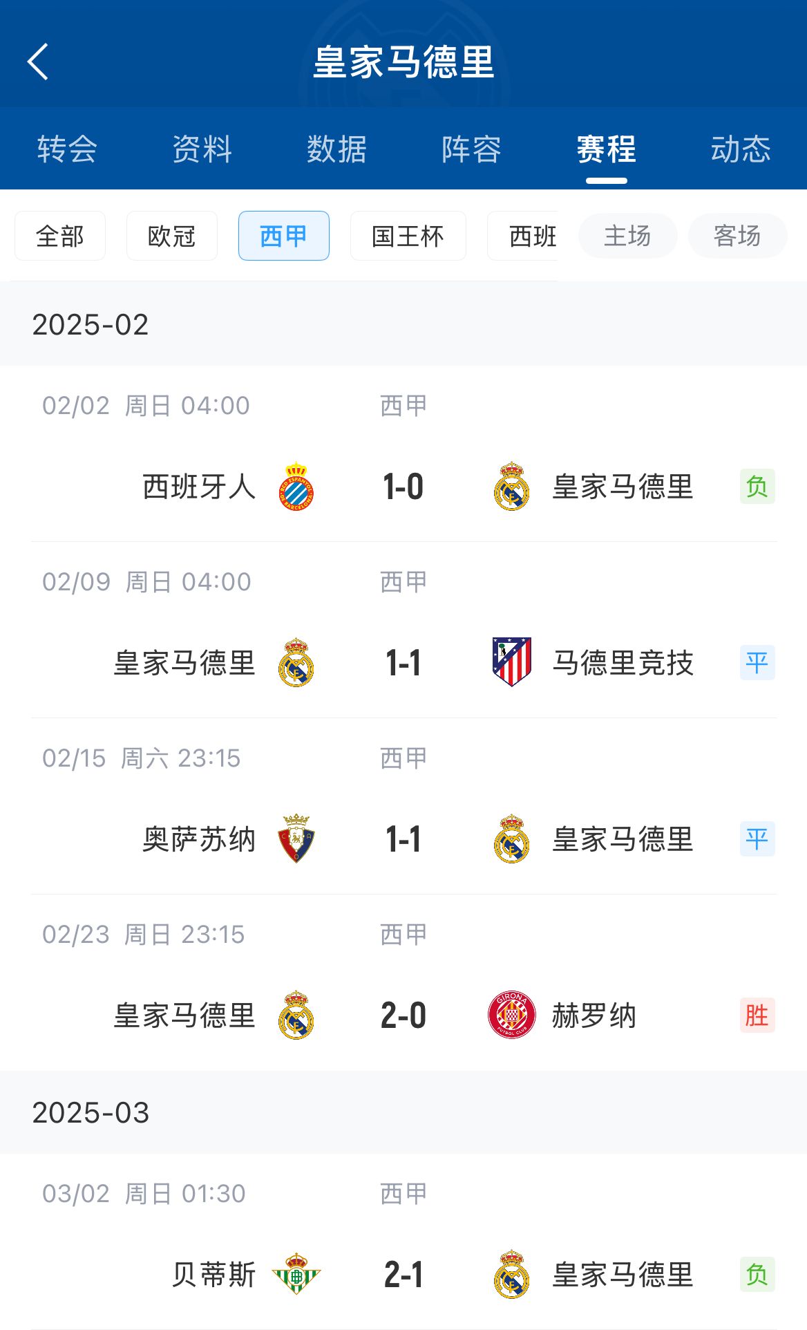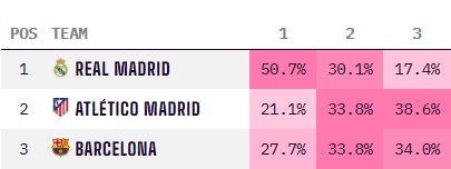 2025-03-02 18:10:515輪僅1勝!皇馬西甲奪冠概率腰斬跌至三強墊底,兩周前還51%領跑