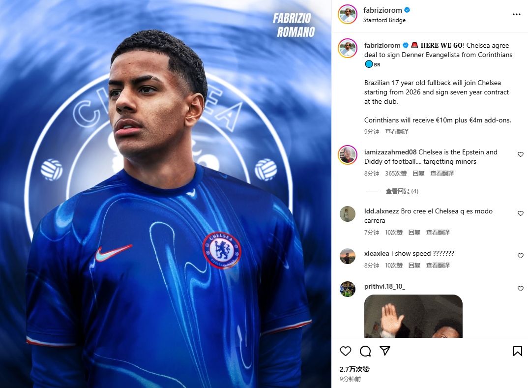 2025-03-02 18:12:06Here we go!羅馬諾:切爾西1400萬(wàn)簽17歲巴西后衛(wèi)登納,26年加盟