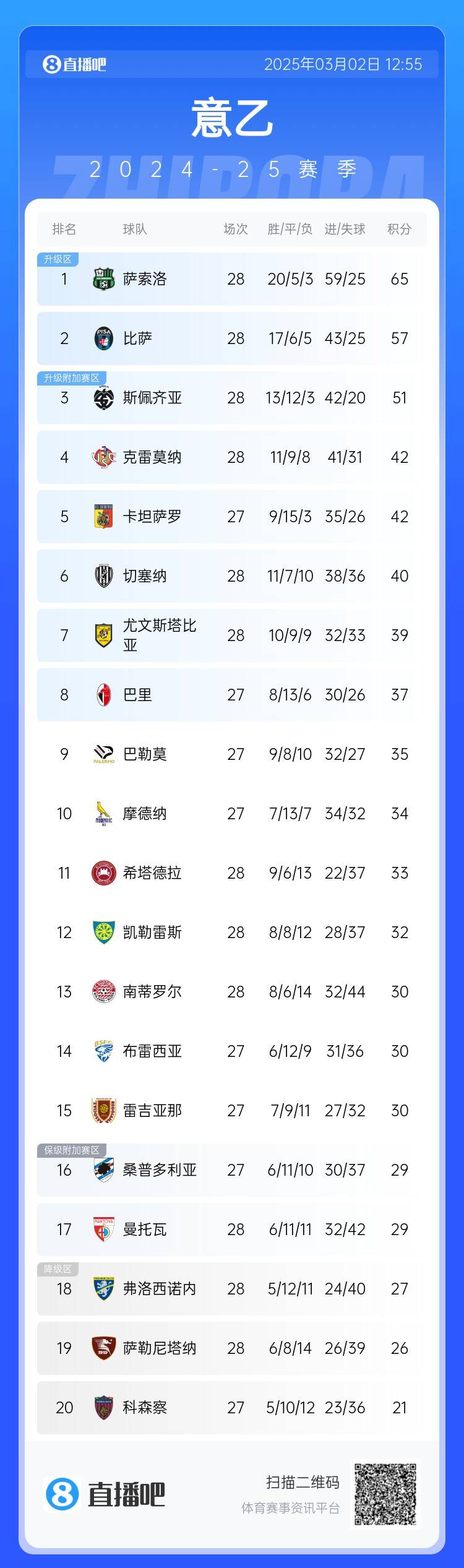 2025-03-02 18:14:58顫抖吧國(guó)米!薩索洛5輪4勝14分領(lǐng)跑意乙直通區(qū),去年雙殺意甲冠軍