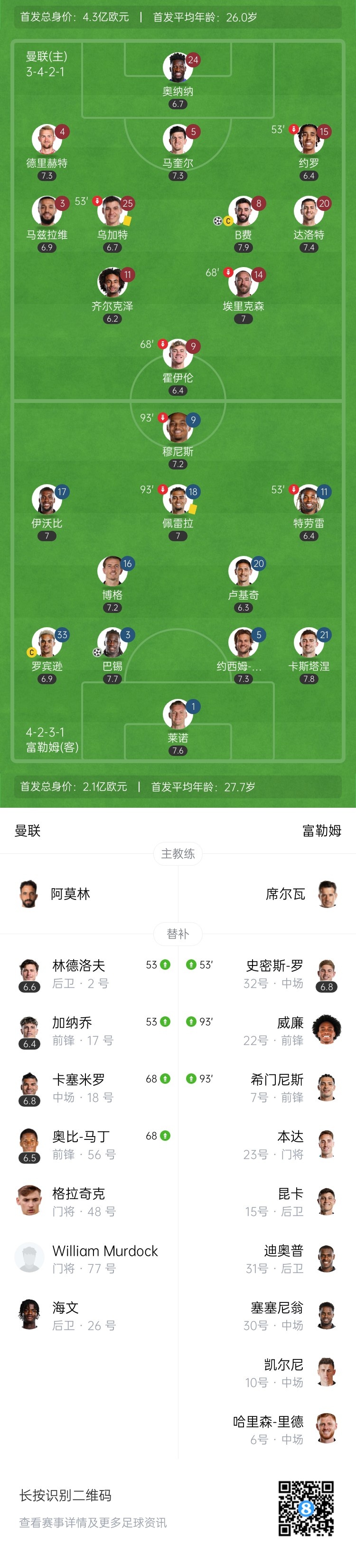 常規(guī)時(shí)間結(jié)束,曼聯(lián)1-1富勒姆,比賽進(jìn)入加時(shí)。