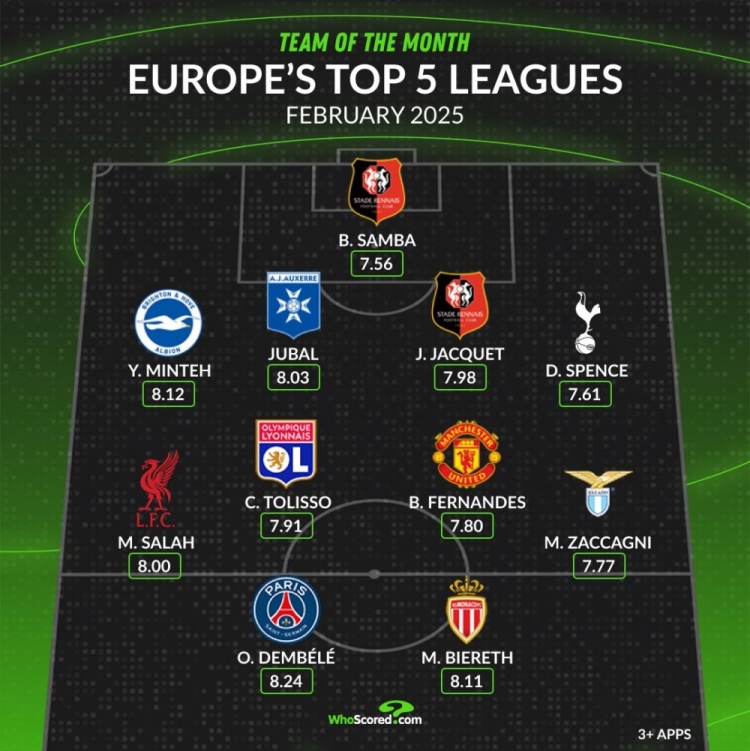 2025-03-03 08:51:09whoscored五大聯(lián)賽2月最佳陣:B費(fèi)&薩拉赫領(lǐng)銜 登貝萊&比雷斯在列
