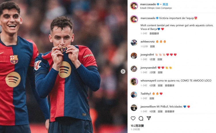 卡薩多也通過社媒曬出自己親吻隊徽的照片,并配文:“球隊拿下重要的勝利!我非常高興能夠打進巴薩生涯處子球,巴薩萬歲!”