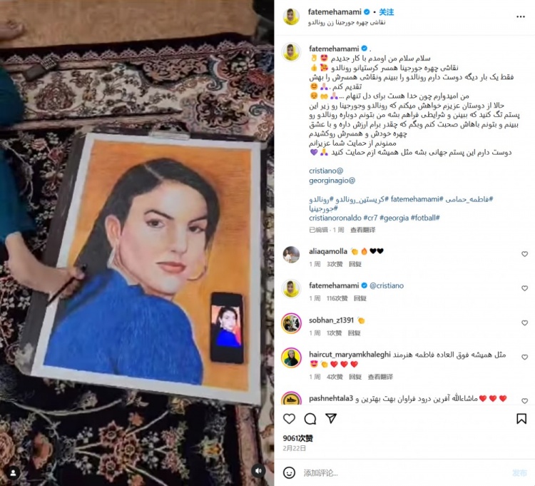 外媒:伊朗一畫家希望向C羅贈(zèng)送禮物,她為喬治娜準(zhǔn)備了畫作