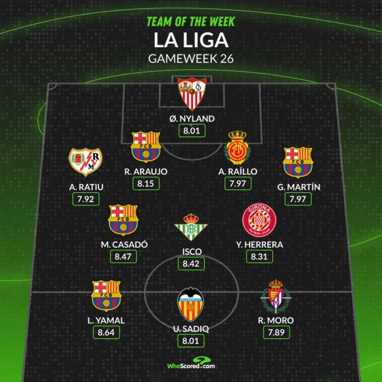 2025-03-04 20:34:28WhoScored評(píng)西甲第二十六周最佳陣:巴薩四名球員入選