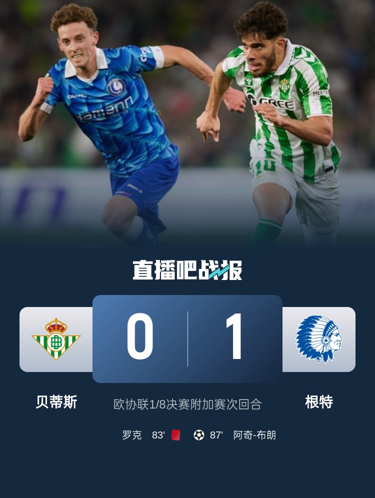 歐協(xié)聯(lián)賽場,貝蒂斯0-1總比分3-1根特進16強,安東尼出戰(zhàn)59分鐘,羅克染紅。