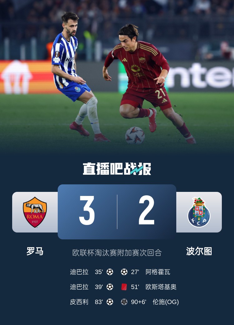 歐聯(lián)杯淘汰賽附加賽次回合,迪巴拉雙響,羅馬主場3-2逆轉(zhuǎn)波爾圖,總比分羅馬4-3淘汰十人波爾圖晉級歐聯(lián)杯16強。