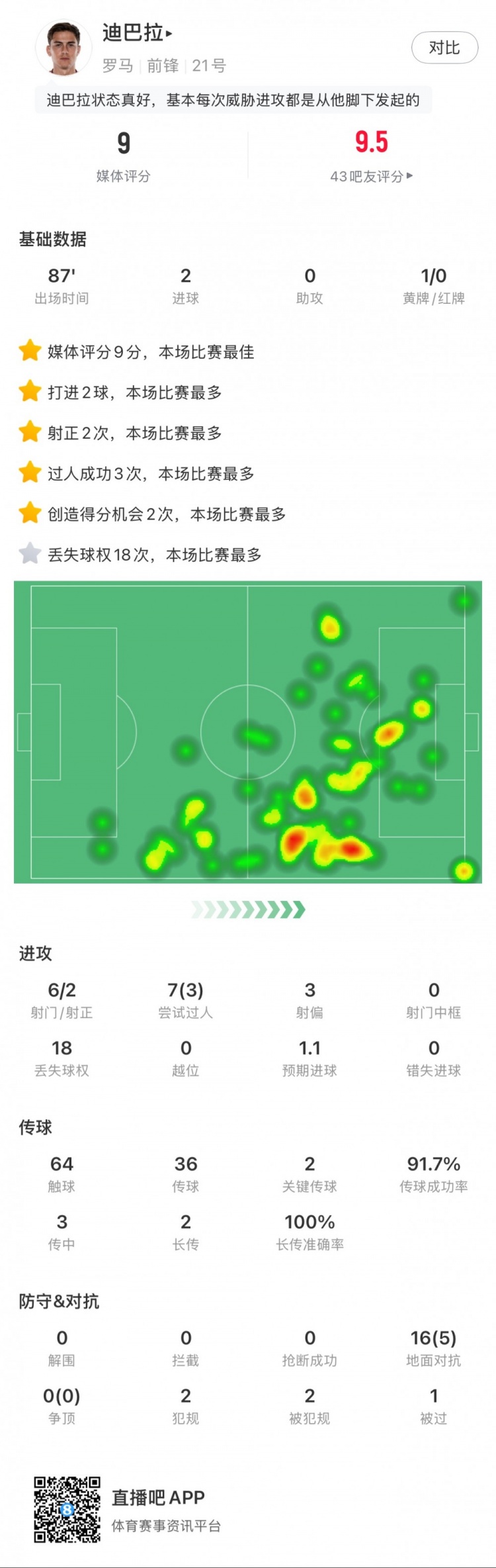 2025-02-21 17:50:23迪巴拉全場(chǎng)數(shù)據(jù):2粒進(jìn)球,2次創(chuàng)造得分機(jī)會(huì),3次成功過人