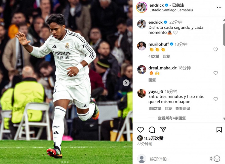 2025-03-05 11:26:23替補(bǔ)登場迎歐冠淘汰賽首秀,恩德里克社媒曬照:享受比賽每個瞬間