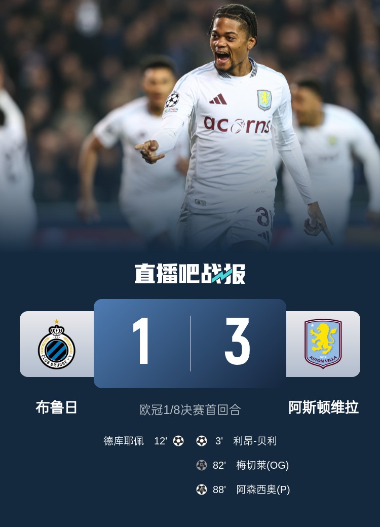 歐冠1/8決賽首回合,維拉3-1布魯日占先機(jī)。上半場,明斯助攻貝利閃擊得手,德克伊珀推射扳平;下半場,阿森西奧替補(bǔ)造險(xiǎn),措利斯失單刀,羅杰斯造梅切勒烏龍,卡什造點(diǎn)阿森西奧點(diǎn)射擴(kuò)大比分。
