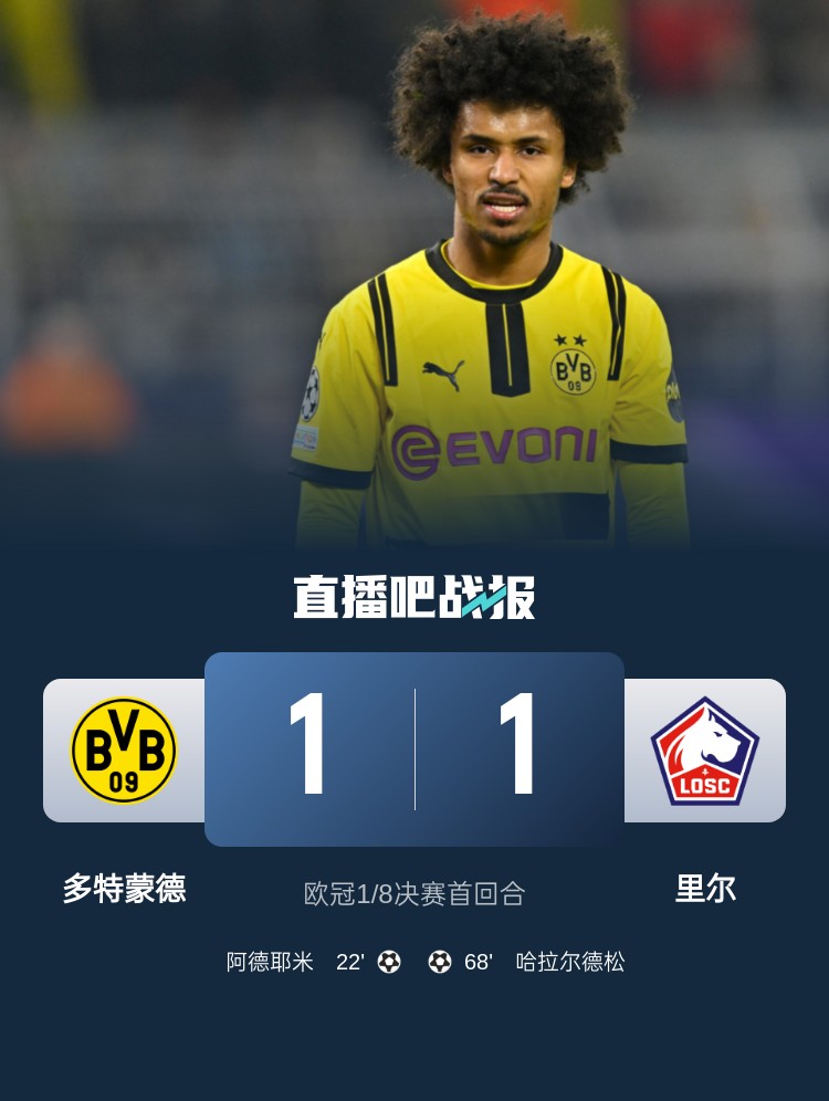 歐冠1/8決賽首回合,多特1-1里爾。上半場,阿德耶米造險(xiǎn)+貼地?cái)仄崎T,格羅斯進(jìn)球被吹;下半場,哈拉爾德松扳平比分。