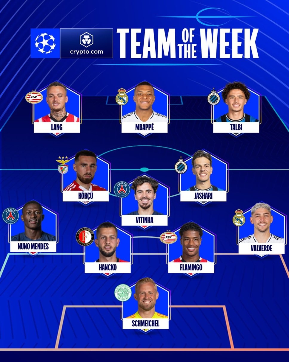 2025-02-21 17:50:39歐冠周最佳陣容:姆巴佩、巴爾韋德、維蒂尼亞、舒梅切爾在列