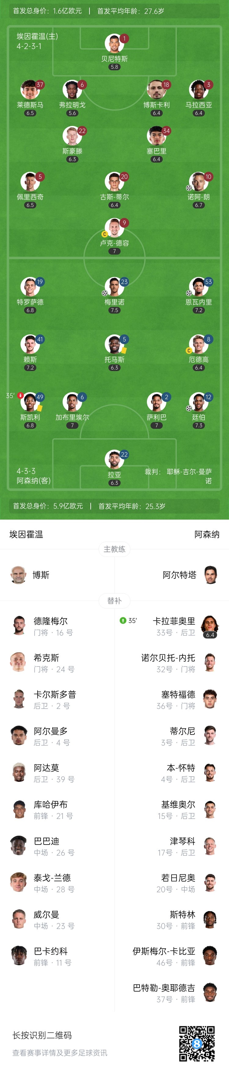 2025-03-05 11:32:38半場-阿森納3-1埃因霍溫 梅里諾建功 托馬斯送點斯凱利染黃被換下