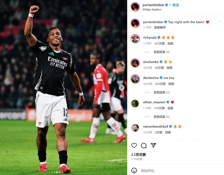 廷伯在本場(chǎng)比賽為槍手第18分鐘頭球首開(kāi)記錄,他也曬出慶祝照并配文:“全隊(duì)表現(xiàn)頂級(jí)的一晚!”