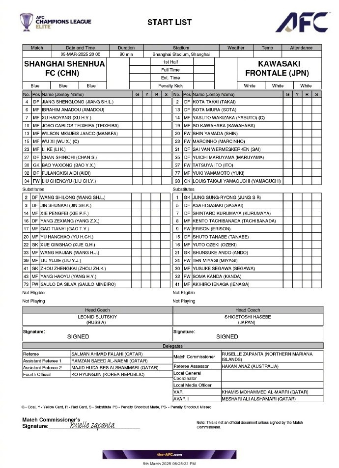 2025-03-05 20:48:11亞冠精英聯賽1/8決賽首回合 上海申花vs川崎前鋒首發(fā)名單 ???