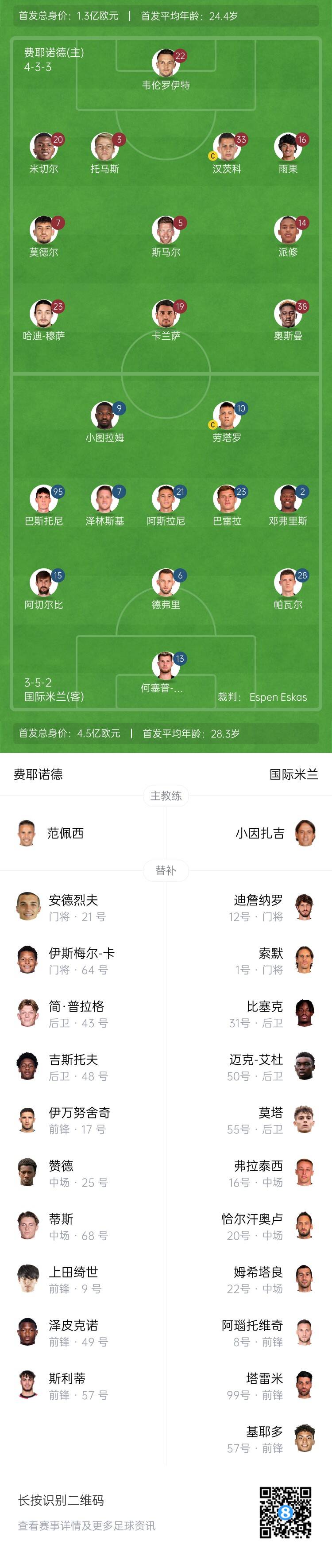 國米替補(bǔ):1-索默、12-迪詹納羅、8-阿瑙托維奇、16-弗拉泰西、20-恰爾汗奧盧、22-姆希塔良、31-比塞克、50-艾杜、55-M-莫塔、57-奎耶托、99-塔雷米