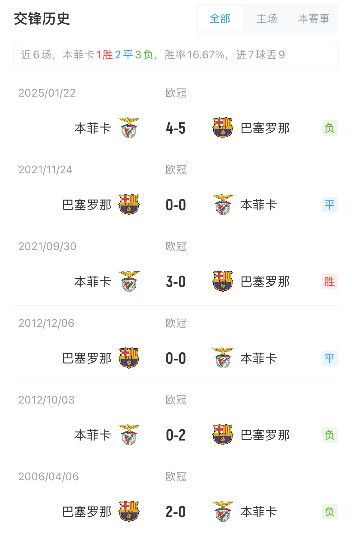 巴薩與本菲卡歷史共交手10次,巴薩4勝4平2負(fù)。兩隊(duì)本賽季歐冠聯(lián)賽階段同組,巴薩客場(chǎng)5-4絕殺本菲卡。