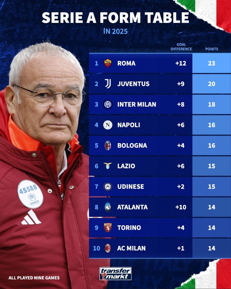 2025-03-07 23:48:51只手補(bǔ)天!2025意甲積分榜:羅馬23分居首,尤文20分、國(guó)米18分