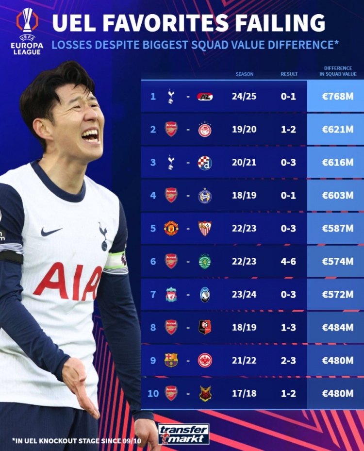 1.熱刺0-1阿爾克馬爾(24-25賽季),7.68億