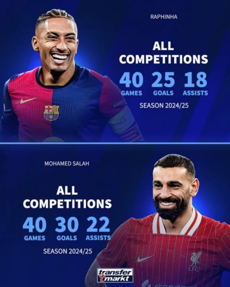 2025-03-08 04:56:13金球獎(jiǎng)兩大熱門?拉菲尼亞40場(chǎng)25球18助攻,薩拉赫40場(chǎng)30球22助攻