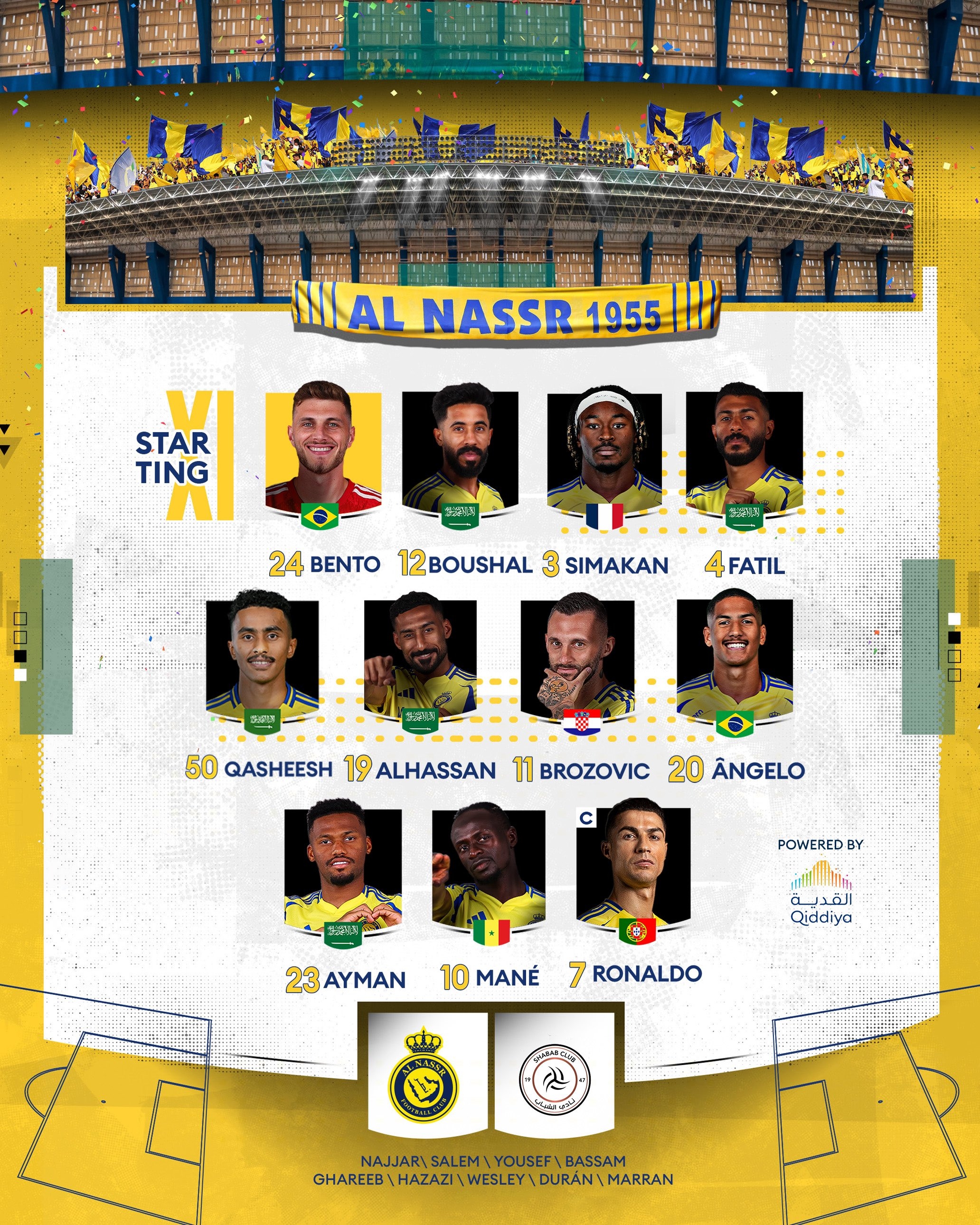 3月8日訊 沙特聯(lián)第24輪,利雅得勝利主場(chǎng)對(duì)陣?yán)诺们嗄耆?。賽前,官方公布了本?chǎng)的首發(fā)名單。