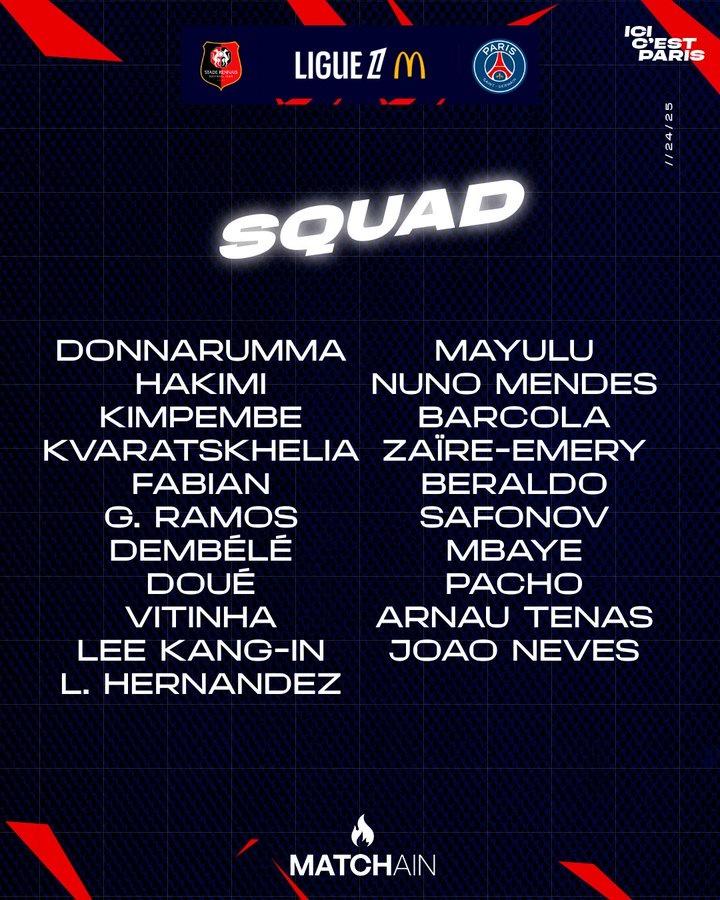 2025-03-08 18:31:54巴黎客戰(zhàn)雷恩大名單:K77、貢薩洛-拉莫斯、登貝萊領(lǐng)銜