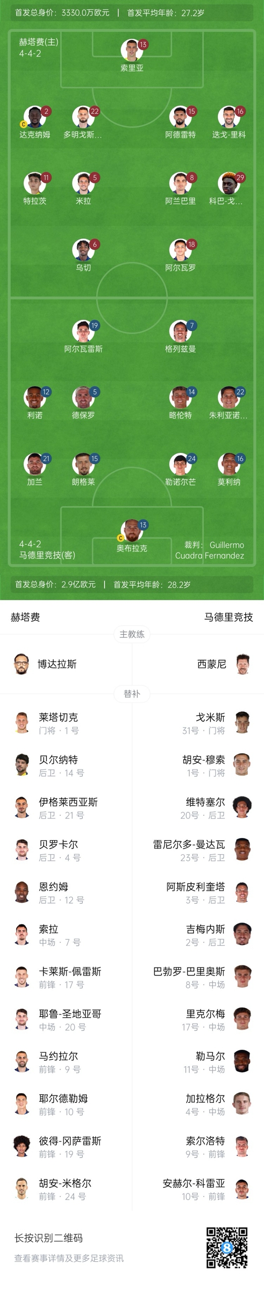 赫塔費(fèi)首發(fā):13-索里亞2-杰內(nèi)、5-米拉、6-烏切、8-阿蘭巴里、11-特拉茨、15-阿爾德雷特、16-里科、18-阿爾瓦羅-羅德里格斯、22-多明戈斯-杜阿爾特、29-科巴-達(dá)科斯塔