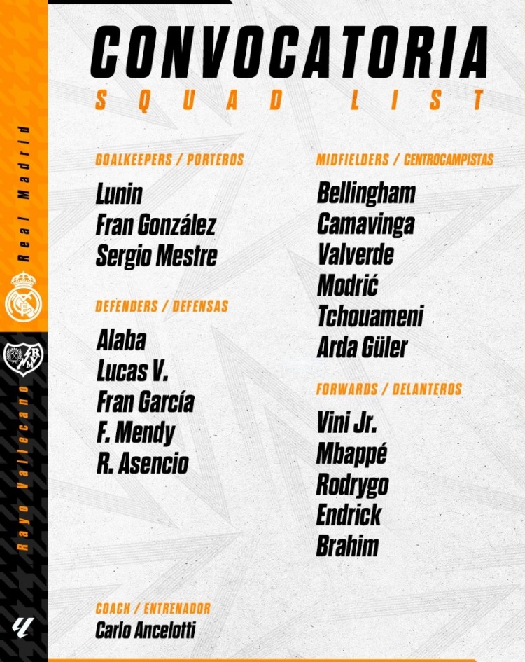 2025-03-09 23:17:43皇馬對陣巴列卡諾大名單:庫爾圖瓦缺席,姆巴佩&巴爾韋德在列