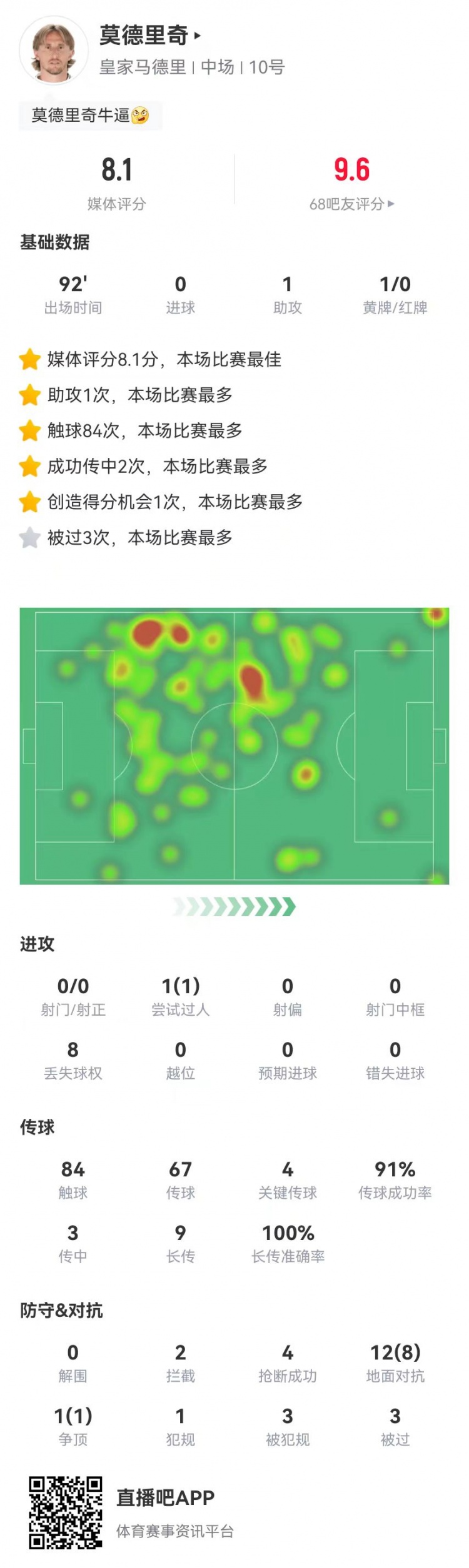 2025-03-10 06:04:46莫德里奇本場(chǎng)1助攻4關(guān)鍵傳球 10長(zhǎng)傳9成功 13對(duì)抗9成功 8.1分最高