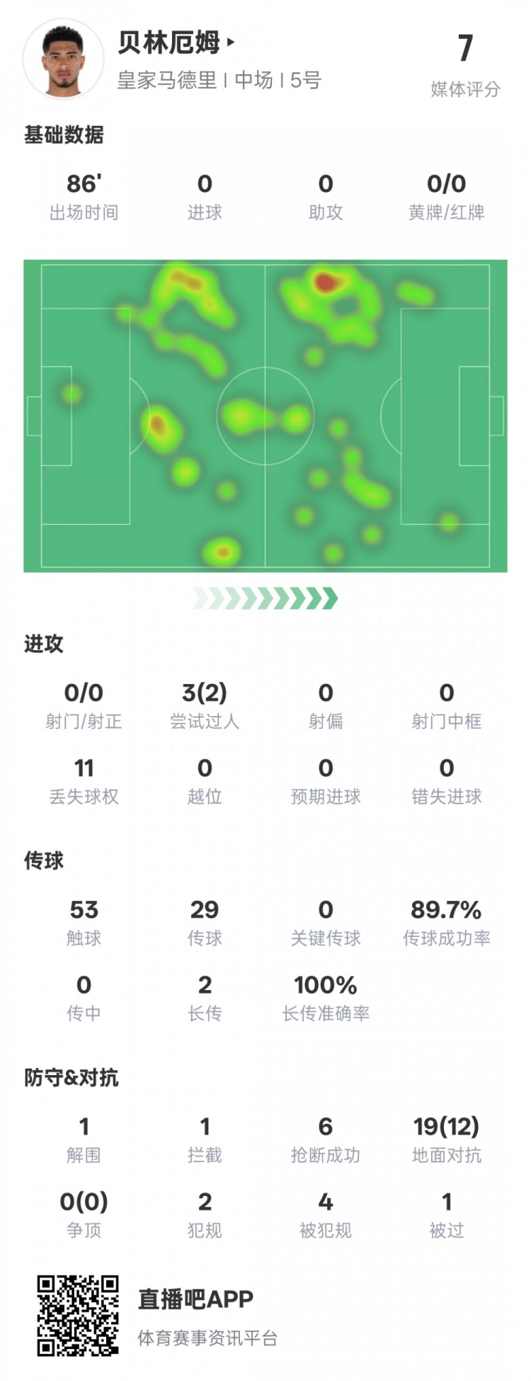 貝林厄姆本場(chǎng)數(shù)據(jù):12次地面對(duì)抗成功2過人成功6搶斷,評(píng)分7.0