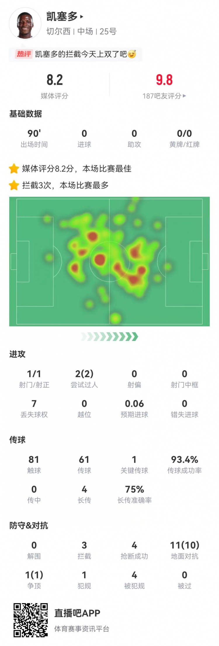 2025-03-10 06:07:19凱塞多本場(chǎng)12對(duì)抗11成功+4造犯規(guī) 3攔截4搶斷0被過 獲評(píng)8.2分最高