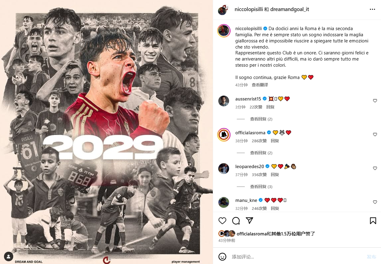 在續(xù)約官宣后皮西利更新了社媒,曬出自己續(xù)約成功的海報(bào),并配文寫道:“這12年來,羅馬一直是我第二個(gè)家,穿上羅馬球衣一直是我的夢想,現(xiàn)在我激動的心情難以言述。能夠代表羅馬出戰(zhàn),我感到非常榮幸,雖然一路走來有歡笑,也有苦澀,但我會為了球隊(duì)付出所有。夢想仍在繼續(xù),謝謝你,羅馬?!?/p>