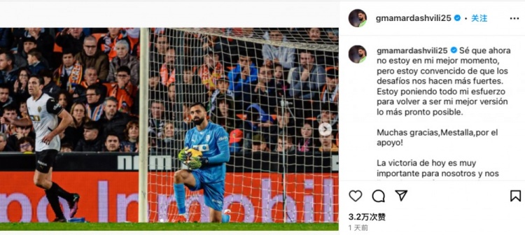 賽后瑪瑪達什維利更新社媒致歉,他寫道:“我清楚自己目前并不在最佳狀態(tài),但是困難會讓人變得更加堅強,接下來我會盡我所能拿出最佳水平。非常感謝梅斯塔利亞球迷們的支持!這場勝利非常重要,并且讓我們打起干勁繼續(xù)應(yīng)對之后的每一場比賽。繼續(xù)前進!”